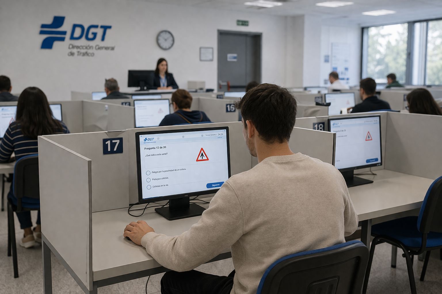 Cuando te indiquen que puedes comenzar, introduces tu DNI en el ordenador y automáticamente aparece tu examen teórico. El examen teórico de la DGT consta de 30 preguntas tipo test, con tres respuestas posibles cada una y solo una correcta, y dispones de 30 minutos para completarlo. Una de las preguntas más buscadas es cuántos fallos se permiten en el examen teórico, y la respuesta es clara,puedes tener como máximo tres fallos para aprobar; con cuatro errores el examen está suspendido. No es necesario agotar el tiempo: si terminas antes, puedes indicarlo levantando la mano, el funcionario comprobará que todo está correcto y podrás enviar el examen.